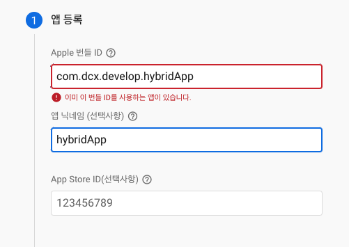 2-2 IOS 번들 ID를 입력(필수), App Store ID 없을때 임의 번호 입력(선택)