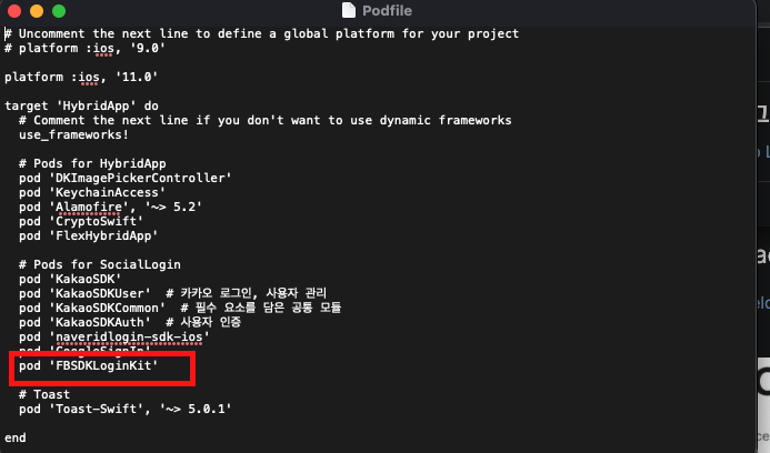 2-1 프로젝트 폴더 안에 podfile 실행 후 pod 'FBSDKLoginKit' 저장